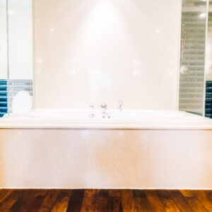 Azure Elegance: Freestanding Bathtub with White and Blue Tile